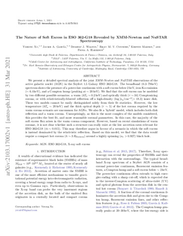 We present a detailed spectral analysis of the joint XMM-Newton and NuSTAR observations of the active galactic nuclei (AGN) in the Seyfert 1.5 Galaxy ESO 362-G18. The broadband ($0.3\mbox{--}79$ keV) spectrum shows the presence of a power-law continuum with a soft excess below $2$ keV, iron K$\alpha$ emission ($\sim 6.4$ keV), and a Compton hump (peaking at $\sim 20$ keV). We find that the soft excess can be modeled by two different possible scenarios: a warm ($kT_\mathrm{e}\sim0.2$ keV) and optically thick ($\tau\sim34$) Comptonizing corona; or with relativistically-blurred reflection off a high-density ($\log{[n_\mathrm{e}/\mathrm{cm}^{-3}]}>18.3$) inner disk. These two models cannot be easily distinguished solely from their fit statistics. However, the low temperature ($kT_\mathrm{e}\sim20$ keV) and the thick optical depth ($\tau\sim5$) of the hot corona required by the warm corona scenario are uncommon for AGNs. We also fit a 'hybrid' model, which includes both disk reflection and a warm corona. Unsurprisingly, as this is the most complex of the models considered, this provides the best fit, and more reasonable coronal parameters. In this case, the majority of the soft excess flux arises in the warm corona component. However, based on recent simulations of warm coronae, it is not clear whether such a structure can really exist at the low accretion rates relevant for ESO 362-G18 ($\dot{m}\sim0.015$). This may therefore argue in favor of a scenario in which the soft excess is instead dominated by the relativistic reflection. Based on this model, we find that the data would require a compact hot corona ($h\sim3\,R_\mathrm{Horizon}$) around a highly spinning ($a_\star>0.927$) black hole.