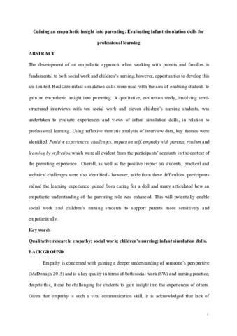 The development of an empathetic approach when working with parents and families is fundamental to both social work and children's nursing; however, opportunities to develop this are limited. RealCare Baby infant simulator dolls were used with the aim of enabling students to gain an empathetic insight into parenting. A qualitative, evaluation study involving semistructured interviews with 10 social work and 11 children's nursing students was undertaken to evaluate experiences and views of infant simulator dolls, in relation to professional learning. Using reflexive thematic analysis of interview data, six key themes were identified: (1) positive experiences, (2) challenges, (3) impact on self, (4) empathy toward parents, (5) realism and (6) learning by reflection. All themes were evident from the participants' accounts in the context of the parenting experience. In addition to the overall positive impact on students, practical and technical challenges were also identified. However, despite these difficulties, participants valued the learning experience gained from caring for a doll and many articulated how an empathetic understanding of the parenting role was enhanced. This will potentially enable social work and children's nursing students to support parents more sensitively and empathetically.