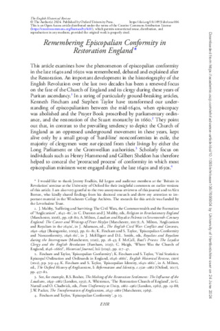 This article examines how the phenomenon of episcopalian conformity in the late 1640s and 1650s was remembered, debated and explained after the Restoration. Drawing on petitions, pamphlets, funeral sermons and clerical biographies, it shows that both personal ambition and polemical advantage encouraged episcopalians to suppress evidence of Interregnum conformity from the moment the king returned in May 1660. Crucially, however, this kind of whitewashing was by no means the only—or even the principal—way in which episcopalian conformists retrospectively presented their own careers. Many clergymen after 1660 were eager to defend their decision to continue ministering publicly under the English Republic, claiming that their proselytising activities in these years had ultimately helped to advance the interests of Church and king. It is argued that these contrasting approaches to remembering conformity reflect the unstable, contested meaning of loyalty, especially after 1649. As well as adding a new dimension to recent literature on the significance of memories of the English Revolution in the late seventeenth century, the article therefore enhances our understanding of episcopalian identities during the 1640s and 1650s, helping to explain why clergymen who considered themselves loyal to the pre-war order could embark on such divergent trajectories when confronted with defeat, disestablishment and regicide.