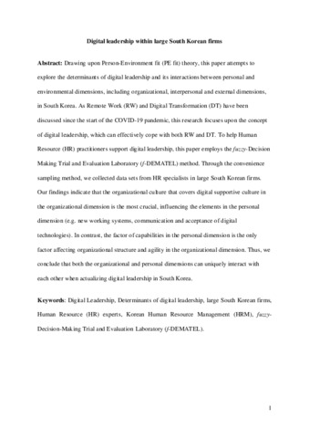 Keywords | digital leadership, human resource (hr) experts, korean human resource management (hrm), determinants of digital leadership, fuzzy-decision-making trial and evaluation laboratory (f-dematel), large south korean firms, business and international management |