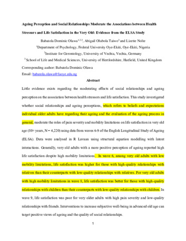 Ageing Perception and Social Relationships Moderate the Associations Between Health Stressors and Life Satisfaction in the Very Old: Evidence from the ELSA Study.