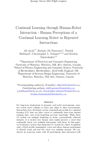 | Keywords | continual learning, long-term human-robot interaction, perceptions of robots, robot learning from human teachers, control and systems engineering, general computer science, social psychology, philosophy, human-computer interaction, electrical and electronic engineering |