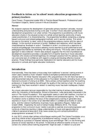 | Additional information | Carol Timson, 'Feedback in Action: An "in-school" music education programme for primary teachers', LINK, Vol. 3 (1), July 2017, available online at http://www.herts.ac.uk/link. Carol Timson- is Programme Leader MSc in Practice Based Research, Professional Lead Foundation Subjects, Senior Lecturer in Music Education, School of Education, University of Hertfordshire. |