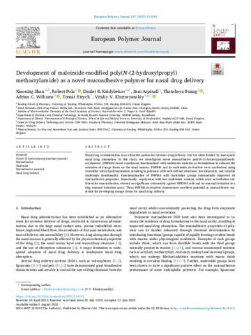 Keywords | maleimide, mucoadhesion, mucoadhesive materials, nasal drug delivery, poly(n-(2-hydroxylpropyl)methacrylamide), general physics and astronomy, organic chemistry, polymers and plastics, materials chemistry |