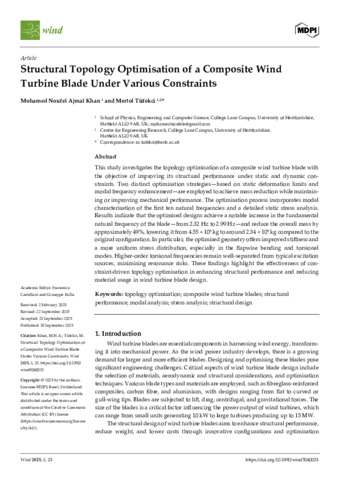 This study investigates the topology optimisation of a composite wind turbine blade with the objective of improving its structural performance under static and dynamic constraints. Two distinct optimisation strategies—based on static deformation limits and modal frequency enhancement—are employed to achieve mass reduction while maintaining or improving mechanical performance. The optimisation process incorporates modal characterisation of the first ten natural frequencies and a detailed static stress analysis. Results indicate that the optimised designs achieve a notable increase in the fundamental natural frequency of the blade—from 2.32 Hz to 2.99 Hz—and reduce the overall mass by approximately 49%, lowering it from 4.55 × 105 kg to around 2.34 × 105 kg compared to the original configuration. In particular, the optimised geometry offers improved stiffness and a more uniform stress distribution, especially in the flapwise bending and torsional modes. Higher-order torsional frequencies remain well-separated from typical excitation sources, minimising resonance risks. These findings highlight the effectiveness of constraint-driven topology optimisation in enhancing structural performance and reducing material usage in wind turbine blade design.