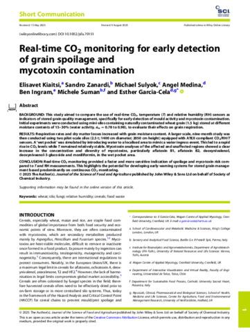 BACKGROUND: This study aimed to compare the use of real‐time CO2, temperature (T) and relative humidity (RH) sensors as indicators of stored grain quality management, specifically for early detection of mould activity and mycotoxin contamination. Initial experiments were conducted using mini‐silos containing naturally contaminated wheat grain (1.5 kg) stored at different moisture contents of 15–30% (water activity, aw = 0.78 to 0.98), to evaluate their effects on grain respiration. RESULTS: Respiration rates and dry matter losses increased with grain moisture content. A larger‐scale, nine‐month study was then conducted using two pilot‐scale silos (2.5 t; 1400 cm diameter; 2050 cm height) equipped with ATEX‐compliant CO2/RH/T sensors. A ‘wet pocket’ was simulated by introducing water to a localised area to mimic a water ingress event. This led to a rapid rise in CO2 levels while T remained relatively stable. Mycotoxin analyses of the affected and unaffected regions showed a clear increase in the concentration and diversity of mycotoxins, particularly aflatoxin B1, aflatoxin B2, deoxynivalenol, deoxynivaenol‐3‐glucoside and moniliformin, in the wet pocket area. CONCLUSION: Real‐time CO2 monitoring provided a faster and more sensitive indication of spoilage and mycotoxin risk compared to T and RH measurements. This highlights the potential for developing early‐warning systems for stored grain management based predominantly on continuous CO2 monitoring. © 2025 The Author(s). Journal of the Science of Food and Agriculture published by John Wiley & Sons Ltd on behalf of Society of Chemical Industry.