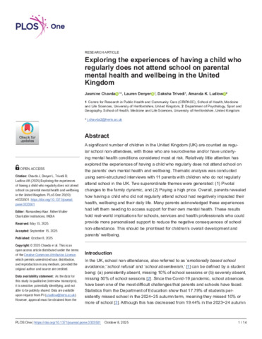 Exploring the experiences of having a child who regularly does not attend school on parental mental health and wellbeing in the United Kingdom
