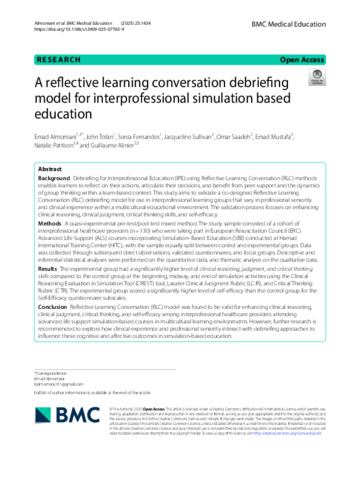 Background Debriefing for Interprofessional Education (IPE) using Reflective Learning Conversation (RLC) methods enables learners to reflect on their actions, articulate their decisions, and benefit from peer support and the dynamics of group thinking within a team-based context. This study aims to validate a co-designed Reflective Learning Conversation (RLC) debriefing model for use in interprofessional learning groups that vary in professional seniority and clinical experience within a multicultural educational environment. The validation process focuses on enhancing clinical reasoning, clinical judgment, critical thinking skills, and self-efficacy. Methods A quasi-experimental pre-test/post-test mixed method. The study sample consisted of a cohort of interprofessional healthcare providers (n = 130) who were taking part in European Resuscitation Council (ERC) Advanced Life Support (ALS) courses incorporating Simulation- Based Education (SBE) conducted at Hamad International Training Center (HITC), with the sample equally split between control and experimental groups. Data was collected through subsequent direct observations, validated questionnaires, and focus groups. Descriptive and inferential statistical analyses were performed on the quantitative data, and thematic analysis on the qualitative data. Results The experimental group had a significantly higher level of clinical reasoning, judgment, and critical thinking skills compared to the control group at the beginning, midway, and end of simulation activities using the Clinical Reasoning Evaluation in Simulation Tool (CREST) tool, Lasater Clinical Judgment Rubric (LCJR), and Critical Thinking Rubric (CTR). The experimental group scored a significantly higher level of self-efficacy than the control group for the Self-Efficacy questionnaire subscales. Conclusion Reflective Learning Conversation (RLC) model was found to be valid for enhancing clinical reasoning, clinical judgment, critical thinking, and self-efficacy among interprofessional healthcare providers attending advanced life support simulation-based courses in multicultural learning environments. However, further research is recommended to explore how clinical experience and professional seniority interact with debriefing approaches to influence these cognitive and affective outcomes in simulation-based education.