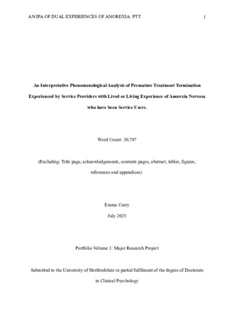 An Interpretative Phenomenological Analysis of Premature Treatment Termination Experienced by Service Providers with Lived or Living Experience of Anorexia Nervosa who have been Service Users