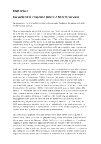Galvanic Skin Response (GSR) - A Short Overview : An Argument for Using Biometrics to Investigate Audience Engagement with Performance Stimuli.