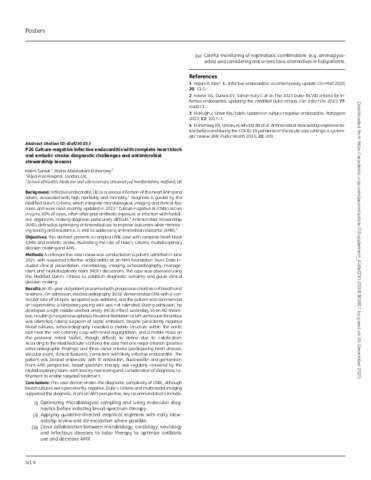 Background Infective endocarditis (IE) is a serious infection of the heart lining and valves, associated with high morbidity and mortality.¹ Diagnosis is guided by the Modified Duke’s Criteria, which integrate microbiological, imaging and clinical features, and were most recently updated in 2023.² Culture-negative IE (CNIE) occurs in up to 20% of cases, often after prior antibiotic exposure or infection with fastidious organisms, making diagnosis particularly difficult.³ Antimicrobial stewardship (AMS), defined as optimizing antimicrobial use to improve outcomes while minimising toxicity and resistance, is vital to addressing antimicrobial resistance (AMR).⁴ Objectives This abstract presents a complex CNIE case with complete heart block (CHB) and embolic stroke, illustrating the role of Duke’s Criteria, multidisciplinary decision-making and AMS. Methods A retrospective case review was conducted on a patient admitted in June 2025 with suspected infective endocarditis at an NHS Foundation Trust. Data included clinical presentation, microbiology, imaging, echocardiography, management and multidisciplinary team (MDT) discussions. The case was assessed using the Modified Duke’s Criteria to establish diagnostic certainty and guide clinical decision-making. Results An 85-year-old patient presented with progressive shortness of breath and tiredness. On admission, ECG demonstrated CHB with a ventricular rate of 38 bpm. Verapamil was withheld, and the patient was commenced on isoprenaline; a temporary pacing wire was not tolerated. During admission, he developed a right middle cerebral artery infarct secondary to an M2 thrombus, resulting in expressive aphasia. No atrial fibrillation or left ventricular thrombus was identified, raising suspicion of septic embolism. Despite persistently negative blood cultures, echocardiography revealed a mobile structure within the aortic root near the non-coronary cusp with trivial regurgitation, and a mobile mass on the posterior mitral leaflet, though difficult to define due to calcification. According to the Modified Duke’s Criteria, the case met one major criterion (positive echocardiographic findings) and three minor criteria (predisposing heart disease, vascular event, clinical features), consistent with likely infective endocarditis. The patient was treated empirically with IV amoxicillin, flucloxacillin and gentamicin. From an AMS perspective, broad-spectrum therapy was regularly reviewed by the MDT, with toxicity monitoring and consideration of diagnostic refinement to enable targeted treatment. Conclusions This case demonstrates the diagnostic complexity of CNIE. Although blood cultures were persistently negative, Duke’s Criteria and multimodal imaging supported the diagnosis. From an AMS perspective, key recommendations include: • Optimising microbiological sampling and using molecular diagnostics before initiating broad-spectrum therapy. • Applying guideline-directed empirical regimens with early stewardship review and de-escalation where possible. • Close collaboration between microbiology, cardiology, neurology and infectious diseases to tailor therapy and optimise antimicrobial use. • Careful monitoring of nephrotoxic combinations (e.g. aminoglycosides) and considering oral or less toxic alternatives in frail patients.