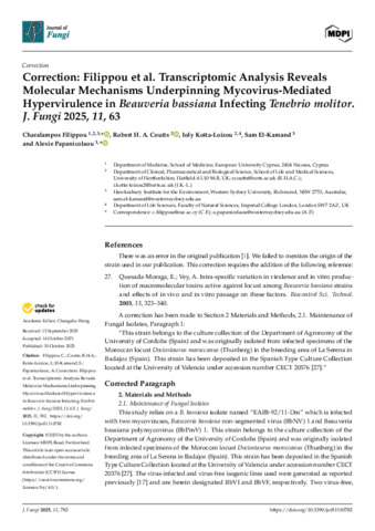 Correction: Filippou et al. Transcriptomic Analysis Reveals Molecular Mechanisms Underpinning Mycovirus-Mediated Hypervirulence in Beauveria bassiana Infecting Tenebrio molitor. J. Fungi 2025, 11, 63