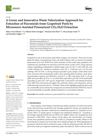 Grapefruit is rich in flavanones, particularly naringin and narirutin. This study investigated the effects of temperature, time, and solid-to-liquid ratio on microwave-assisted pressurized CO2–H2O (MWP-CO2-H2O) extraction of flavonoids from grapefruit and optimized the parameters for maximum total flavonoid content (TFC) using response surface methodology. Independent variable ranges were 110–160 °C, 4.00–14.00 min, and 1:10.00–1:40.00 g/mL. Optimum conditions were 128 °C, 13.88 min, and 1:31.35 g/mL, yielding a TFC of 27.96 ± 1.29 mg naringin equivalent/g dry weight. Under these conditions, extraction yield, total phenolic content, ferric reducing ability of plasma, cupric reducing antioxidant capacity, and DPPH IC50 were 55.17 ± 1.90% (dry basis), 25.42 ± 1.39 mg gallic acid equivalent/g, 39.16 ± 1.61 µmol trolox equivalent/g, 81.64 ± 0.29 µmol trolox equivalent/g, and 1.60 ± 0.01 mg/mL, respectively. Compared to conventional extraction (CE), MWP-CO2-H2O produced higher TFC, phenolic content, and antioxidant activity, while reducing extraction time by 13.68-fold. These results highlight grapefruit peel waste as a sustainable source of bioactive compounds and demonstrate that MWP-CO2-H2O is an environmentally sustainable, efficient alternative to conventional methods.