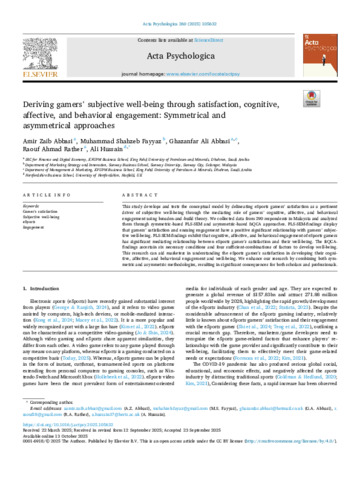 Deriving gamers' subjective well -being through satisfaction , cognitive, affective, an d behavioral engagement : Symmetrical and asymmetrical approaches