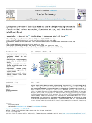 Synergistic approach to colloidal stability and thermophysical optimisation of multiwalled carbon nanotubes, aluminium nitride, and silver-based hybrid nanofluids