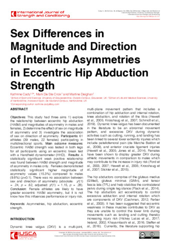 ABSTRACT Objectives This study had three aims 1) To investigate the effect of sex and leg dominance on eccentric hip abduction (HABd) strength 2) determine sex differences in magnitude of asymmetry and 3) determine the association of sex and direction of asymmetry. Design Cross-sectional study Setting University laboratory Participants 61 athletes (39 males, 22 females) participating in sports requiring change of direction (COD) Main outcome measures Eccentric HABd strength was tested in both legs for all participants using an eccentric break test with a Handheld dynamometer (HHD). Results This study found no interaction of sex and leg dominance on eccentric HABd strength (absolute: p=0.52, adjusted p=0.10). Significant main effects were found for leg dominance (absolute: p=<0.01, η2=0.22, adjusted: p=0.00, η2=0.16) and sex on absolute (p=<0.01, η2=0.31) but not adjusted eccentric HABd strength (p=0.08, η2=0.05). Females demonstrated statistically significant higher magnitude of asymmetry values (15.3%) compared to males (9.8%) (p=0.01). There was no association between sex and direction of asymmetry (absolute: χ2(1) = .24, p = .62, adjusted: χ2(1) = 1.15, p = .28). Conclusion Female athletes are likely to have greater eccentric HABd asymmetry which may predispose them to adverse lower extremity biomechanics and increase injury risk.