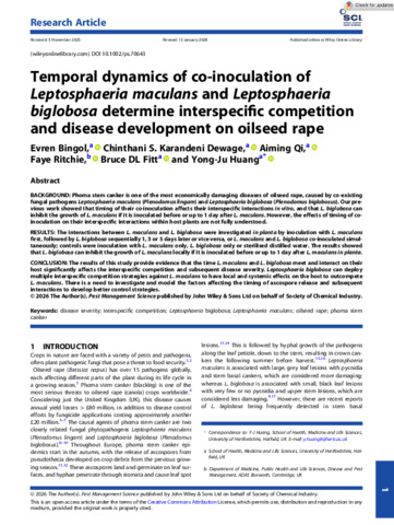Temporal dynamics of co-inoculation of Leptosphaeria maculans and L. biglobosa determine interspecific competition and disease development on oilseed rape : Co-inoculation timing affects disease development