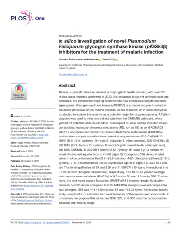 In silico investigation of novel Plasmodium Falciparum glycogen synthase kinase ( pf GSk3β) inhibitors for the treatment of malaria infection