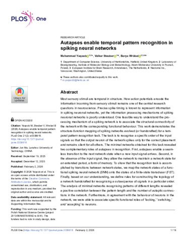 Most sensory stimuli are temporal in structure. How action potentials encode the information incoming from sensory stimuli remains one of the central research questions in neuroscience. Precise spike timing is known to represent information in spiking neuronal networks, yet the information processing mechanisms of spiking neuronal networks is poorly understood. One feasible way to understand the processing mechanism of a spiking network is to associate the structural connectivity of the network with the corresponding functional behaviour. This work demonstrates the structure-function mapping of spiking networks evolved (or handcrafted) for a temporal pattern recognition task. The task is to recognise a specific order of the input signals so that the output neuron of the network spikes only for the correct placement and remains silent for all others. The minimal networks obtained for this task revealed two complementary roles of autapses in recognition. First, autapses enable a seamless transition to the next network state when a new input signal arrives. Second, in the absence of the input signal, they allow the network to maintain a network state for an extended period, a form of memory. To show that the recognition task is accomplished by transitions between network states, we map the network states of a functional spiking neural network (SNN) onto the states of a finite-state transducer (FST). Finally, based on our understanding, we define rules for constructing the topology of a network handcrafted for recognising a subsequence of signals in a particular order. The analysis of minimal networks recognising patterns of different lengths revealed a positive correlation between the pattern length and the number of autaptic connections in the network. Furthermore, in agreement with the behaviour of neurons in the network, we were able to associate specific functional roles of ’locking,’ ’switching,’ and ’accepting’ to neurons.