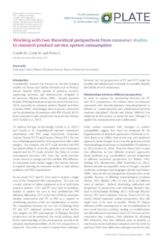 This paper discusses whether and how two different perspectives ion consumer studies can be combined to study product service system consumption and whether a unified narrative can emerge. It was used to support a workshop at the PLATE conference in 2017.