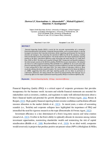 Financial Reporting Quality (FRQ) is crucial for the accurate representation of a company’s financial performance and position. Corporate documentation, such as annual reports, is used by managers to enhance their investment decisions. Better reporting could improve the investment decisions of managers, thus improving the Investment Efficiency (IE) of the company, avoiding both overinvestment and underinvestment. This study examines the impact of financial reporting quality on the firms' investment efficiency using accounting and stock data for U.S. listed firms from 2010 to 2022. The data were acquired through CRSP, Compustat and BoardEx databases. Our final sample consists of 10,350 firms yielding 70,939 firm-to-year observations. We adopted the Chen et al. (2011) approach defining FRQ and Biddle et al. (2009) for IE. Our results show that financial reporting quality is positively related to investment efficiency and that this positive effect is more pronounced in firms with aged CEOs. The paper conducts robustness checks on these results by utilizing alternative empirical models. The results lend support to the theory by Biddle et al. (2009), suggesting that firms with high reporting quality are less likely to overinvest or underinvest. Moreover, this study extends the research by demonstrating that CEO age has an enhancing effect on the impact of financial reporting quality (FRQ) on investment efficiency (IE).