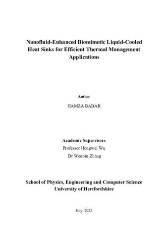 The escalating demand for compact, high-performance electronic devices, driven by the rapid advancement of artificial intelligence, electric vehicles, and data-intensive technologies, has imposed significant thermal management challenges. Traditional air-cooled and straight-channel liquid cooling systems are increasingly inadequate in addressing the high heat fluxes generated by these technologies, particularly when operating under space, energy, and sustainability constraints. This thesis addresses the urgent need for efficient, scalable, and adaptive cooling solutions through the experimental development and evaluation of novel biomimetic liquid-cooled heat sink designs integrated with nanofluid technology. This research adopts an interdisciplinary approach, combining thermofluids, materials science, and biomimetic design. It introduces a new concept in heat sink design inspired by the fluid dynamics of aquatic organisms such as tuna and the black ghost knifefish, novel heat sink designs were conceived to optimise flow dynamics, reduce pressure loss, and maximise heat transfer. These designs depart from traditional linear geometries, encouraging researchers to view nature as a blueprint for rethinking engineering solutions. The bioinspired hybrid pin-fin geometries were designed, fabricated, and optimised under varying operating conditions. The final optimised Staggered Arranged Airfoil Integrated Split Corrugated Curvilinear Pin-Fin (SAISCCPF) configuration create secondary flow paths, enhance mixing, and promote turbulence, thereby improving heat transfer performance while providing alternative passages in case of channel blockage. A series of quantitative, experimental investigations were carried out to examine the hydrothermal performance of different heat sink configurations under varying Reynolds numbers and heating powers. The study began with straight-channel and inline pin-fin configurations, then advanced to staggered and split-fin biomimetic designs. Using a custom-built test facility, the experiments evaluated key performance parameters including Nusselt number, pressure drop, wall temperature, thermal resistance, and temperature distribution. The experimental methodology was rigorously validated, and data was collected across a broad range of flow rates and thermal loads to ensure robustness and repeatability. Parallel to the heat sink design investigations, this work also involved the formulation and testing of mono, binary, and tri-hybrid nanofluids. These nanofluids were based on carefully selected nanoparticles include metallic (silver, Ag), ceramic (aluminium nitride, AlN; silicon carbide, SiC; beryllium oxide, BeO), and carbon-based (multi-walled carbon nanotubes, MWCNTs) materials, each chosen for their unique combination of thermophysical properties, particle morphology, cost, and chemical compatibility with water. The nanofluids were prepared using a two-step method involving ultrasonication and surfactant-assisted dispersion to ensure long-term colloidal stability and avoid agglomeration, a critical factor for maintaining consistent thermal and hydraulic performance. The research was structured into two phases. In the first phase, mono and hybrid nanofluids based on Ag, BeO, and SiC were synthesised and tested. Among these, Ag-based nanofluids delivered the highest thermal conductivity improvement of approximately 6.95%, while BeO offered minimal viscosity increase, and SiC provided a cost-effective compromise. Hybrid nanofluids such as Ag–SiC (60:40) achieved conductivity gains up to 7.43% with balanced hydraulic performance. A subsequent study focused on nanofluids containing MWCNTs, Ag, and AlN. While MWCNTs exhibited superior heat transfer capability, they suffered from stability issues. Tri-hybrid nanofluid MWCNTs/Ag/AlN, particularly the formulations 20:40:40 and 20:60:20, demonstrated an optimal combination of high thermal conductivity, suspension stability, and manageable viscosity, emerging as the most promising formulation. Phase II involved experimental thermal-hydraulic evaluation of the nanofluids developed in Phase I, applied across novel biomimetic heat sink designs. The phase began by testing a conventional straight-channel heat sink with a hydrophobic-coated surface using water. While the hydrophobic treatment moderately reduce pressure drop, limitations remained in improving heat transfer. This was followed by a comparative study with the newly designed Airfoil Integrated Corrugated Curvilinear Pin-Fin (AICCPF) configuration. The results showed an approximately 103% improvement in Nusselt number, while the pressure drop also increased by around 37.5% compared to the straight-channel design. These enhanced biomimetic configurations were then evaluated using Ag, BeO, and SiC nanofluids and their hybrids. Ag-based fluids once again demonstrated the best thermal performance, while BeO continued to show minimal flow resistance. Among hybrids, Ag–SiC mixtures sustained high Nusselt number enhancements with manageable pressure drop penalties, especially under the SAICCPF geometry. In the final stage, the optimised heat sinks were tested using MWCNTs, Ag, and AlN nanofluids including mono, binary, and tri-hybrid formulations. The SAISCCPF configuration, coupled with the (20:60:20) tri-hybrid nanofluid, achieved the best overall performance with a Nusselt number enhancement of around 17% at 325 W. While the pressure drop increased modestly to approximately 475 Pa, this was justified by the substantial thermal gains and enhanced flow distribution. The design's multi-path structure and local swirl generation proved effective in maintaining particle suspension, reducing agglomeration, and maximising convective performance across all tested fluids and conditions. This thesis contributes a foundational understanding of hybrid nanofluid behaviour in complex geometrical domains and provides robust experimental data to support future designs. Future research