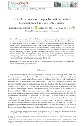This article examines approaches to the history of 19th‐century politics in Britain and Ireland in order to propose fruitful directions for further debate. It argues that historians should return to a more holistic view of the practices of political action and democratisation, reframing the divide between social movements, parties and popular politics through a focus on organising. We propose a shift from foregrounding franchise extension as the principal narrative of the 19th century and to focus instead on forms of organising political participation as means of asserting and developing practices of popular sovereignty throughout the period. Recipes – rather than repertoires – offer a metaphor for variety and change in the ingredients and environments for organising. This article emphasises a comparative and global framework for understanding practices of politics, including organising, in the British Isles.