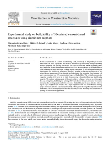 Experimental study on buildability of 3D-printed cement-based structures using aluminium sulphate.