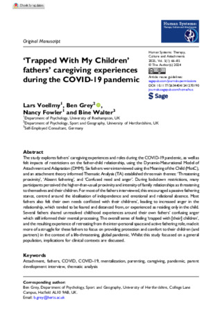 The study explores fathers’ caregiving experiences and roles during the Covid-19 pandemic, as well as felt impacts of restrictions on the father- child relationship, using the Dynamic-Maturational Model of Attachment and Adaptation (DMM). Six fathers were interviewed using the Meaning of the Child (MotC), and an attachment theory informed Thematic Analysis (TA) established three main themes: ‘Threatening proximity’, ‘Absent fathering’, and ‘Confused need and anger’. During lockdown restrictions, many participants perceived the higher-than-usual proximity and intensity of family relationships as threatening to themselves and their children. For most of the fathers interviewed, this encouraged a passive fathering stance, centered around the idealisation of independence and emotional and relational absence. Most fathers also felt their own needs conflicted with their childrens’, leading to increased anger in the relationship, which tended to be feared and distanced from, or experienced as residing only in the child. Several fathers shared unresolved childhood experiences around their own fathers’ confusing anger which still informed their mental processing. The overall sense of feeling ‘trapped with [their] children’, and the resulting experience of retreating from the inter-personal space and active fathering role, made it more of a struggle for these fathers to focus on providing protection and comfort to their children (and partners) in the context of a life- threatening, global pandemic. Whilst this study focused on a general population, implications for clinical contexts are discussed.