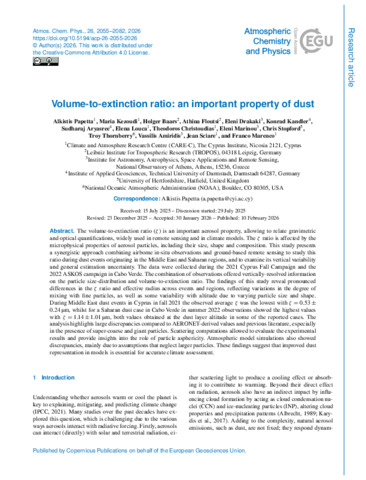 The volume-to-extinction ratio (ζ) is an important aerosol property, allowing to relate gravimetric and optical quantifications, widely used in remote sensing and in climate models. The ζ ratio is affected by the microphysical properties of aerosol particles, including their size, shape and composition. This study presents a synergistic approach combining airborne in-situ observations and ground-based remote sensing to study this ratio during dust events originating in the Middle East and Saharan regions, and to examine its vertical variability and general estimation uncertainty. The data were collected during the 2021 Cyprus Fall Campaign and the 2022 ASKOS campaign in Cabo Verde. The combination of observations offered vertically-resolved information on the particle size-distribution and volume-to-extinction ratio. The findings of this study reveal pronounced differences in the ζ ratio and effective radius across events and regions, reflecting variations in the degree of mixing with fine particles, as well as some variability with altitude due to varying particle size and shape. During Middle East dust events in Cyprus in fall 2021 the observed average ζ was the lowest with ζ=0.53±0.24 µm, whilst for a Saharan dust case in Cabo Verde in summer 2022 observations showed the highest values with ζ=1.14±1.01 µm, both values obtained at the dust layer altitude in some of the reported cases. The analysis highlights large discrepancies compared to AERONET-derived values and previous literature, especially in the presence of super-coarse and giant particles. Scattering computations allowed to evaluate the experimental results and provide insights into the role of particle asphericity. Atmospheric model simulations also showed discrepancies, mainly due to assumptions that neglect larger particles. These findings suggest that improved dust representation in models is essential for accurate climate assessment.