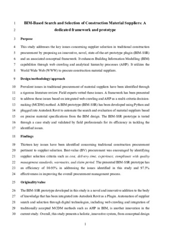 | Keywords | bim-ssr, best-value procurement, building information modelling (bim), construction procurement, supplier selection, web crawling, control and systems engineering, general computer science, architecture , civil and structural engineering, building and construction |