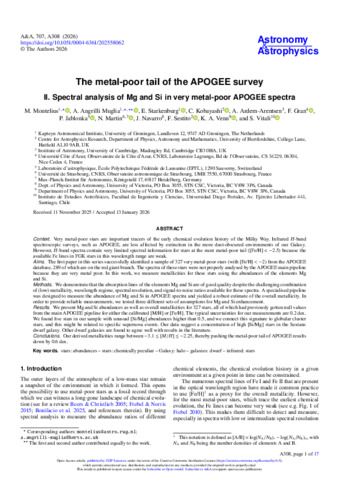Context. Very metal-poor stars are important tracers of the early chemical evolution history of the Milky Way. Infrared H-band spectroscopic surveys, such as APOGEE, are less affected by extinction in the more dust-obscured environments of our Galaxy. However, H-band spectra contain very limited spectral information for stars at the most metal-poor tail ([Fe/H] < −2.5) because the available Fe lines in FGK stars in this wavelength range are weak.Aims. The first paper in this series successfully identified a sample of 327 very metal-poor stars (with [Fe/H] < −2) from the APOGEE database, 289 of which are on the red giant branch. The spectra of these stars were not properly analysed by the APOGEE main pipeline because they are very metal poor. In this work, we measure metallicities for these stars using the abundances of the elements Mg and Si.Methods. We demonstrate that the absorption lines of the elements Mg and Si are of good quality despite the challenging combination of (low) metallicity, wavelength regime, spectral resolution, and signal-to-noise ratios available for these spectra. A specialised pipeline was designed to measure the abundance of Mg and Si in APOGEE spectra and yielded a robust estimate of the overall metallicity. In order to provide reliable measurements, we tested three different sets of assumptions for Mg and Si enhancement.Results. We present Mg and Si abundances as well as overall metallicities for 327 stars, all of which had previously gotten null values from the main APOGEE pipeline for either the calibrated [M/H] or [Fe/H]. The typical uncertainties for our measurements are 0.2 dex. We found five stars in our sample with unusual [Si/Mg] abundances higher than 0.5, and we connect this signature to globular cluster stars, and this might be related to specific supernova events. Our data suggest a concentration of high [Si/Mg] stars in the Sextans dwarf galaxy. Other dwarf galaxies are found to agree well with results in the literature.Conclusions. Our derived metallicities range between −3.1 ≤ [M/H] ≤ −2.25, thereby pushing the metal-poor tail of APOGEE results down by 0.6 dex.