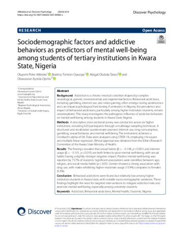 Sociodemographic Factors and Addictive Behaviors as Predictors of Mental WellBeing Among Students of Tertiary Institutions in Kwara State, Nigeria