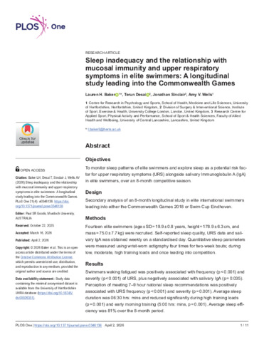 Sleep inadequacy and the relationship with mucosal immunity and upper respiratory symptoms in elite swimmers: A longitudinal study leading into the Commonwealth Games