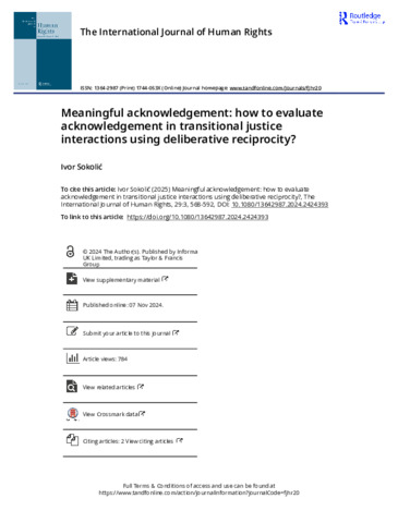 Acknowledgment of wrongdoing is considered necessary for relationship transformation in processes of transitional justice. However, the concept has only been studied in the institutional and legal context. Its social and interpersonal dimensions at the micro level remain poorly understood. This article addresses this gap by studying interactions between ordinary citizens across ethnic lines in response to war crimes trials. The article uses deliberative reciprocity to create a novel typology to identify meaningful acknowledgement in 162 inter-ethnic exchanges derived from focus groups in four former Yugoslav countries. The study also identifies what triggers this ideal type and finds that the triggers are related to conversational changes in identity constructions and knowledge claims. But the triggers only occur when individuals also endorse each other’s views across ethnic lines. The article thus shows how relationships transform in inter-ethnic interactions, even when individuals hold differing views and arguments about transitional justice.