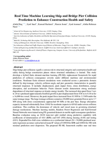 Ship–bridge pier collisions signify a serious risk to structural integrity and construction health and safety during bridge construction phases where structural redundancy is limited. This study develops a hybrid finite element–machine learning (FE–ML) replacement framework for rapid prediction of collision consequence severity under different maritime and environmental conditions. Nonlinear finite element (FE) simulations were conducted across a parametric domain defined by ship tonnage, velocity, collision angle and pier geometric characteristics to quantify structural responses. It includes displacement, peak impact force, stress distribution, energy absorption and acceleration behaviour. FE results demonstrate strong nonlinear dependence of structural response on kinetic energy transfer. The increased ship speed from 5 to 20 m/s produced approximately fourfold growth in pier displacement from 0.08 to 0.30 m for a 16,000-ton vessel. Moreover, the peak impact force increased from 0.8 MN to 3.5 MN under the same tonnage range. The large tonnage collision scenarios (50,000 tons) generated forces up to 5.7 MN along with stress concentrations approached 90 MPa at the pier base. Energy absorption capacity increased substantially from 180 kJ for moderate impacts to 650 kJ under severe collision conditions. This confirms the dominance of velocity and vessel mass in governing structural damage mechanisms. ML models, random forest regression and feedforward neural networks (NNs) were trained using FE-generated datasets to enable rapid consequence prediction. Baseline evaluation using an 80/20 train–test split yielded strong predictive capability with coefficients of determination of 0.93 (random forest regressor [RFR]) and 0.95 (NN) during training (0.89) and testing (0.91). Expanded fivefold cross-validation on a synthesized dataset (N = 50,000) produced near-unity regression accuracy and achieved mean R2 values of 0.9980 for RFR and 0.9988 for NN with minimal prediction error dispersion. The proposed FE–ML framework enables near real-time estimation of ship collision consequence severity and establishes a direct linkage between navigation parameters and structural response demand. The results support implementation within construction health and safety management systems for rapid hazard screening, protective design optimization and proactive maritime traffic control.