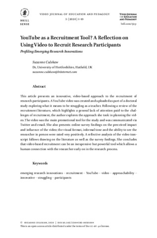 This article presents an innovative, video-based approach to the recruitment of research participants. A YouTube video was created and uploaded as part of a doctoral study exploring what it means to be struggling as a teacher. Following a review of the recruitment literature, which highlights a general lack of attention paid to the challenges of recruitment, the author explores the approach she took in planning the video. The video was the main promotional tool for the study and was communicated via Twitter and email. She also presents online survey findings on the perceived impact and influence of the video; the visual format, informal tone and the ability to see the researcher in person were rated very positively. A reflective analysis of the video transcript follows drawing on the literature as well as the survey findings. She concludes that video-based recruitment can be an inexpensive but powerful tool which allows a human connection with the researcher early on in the research process.
