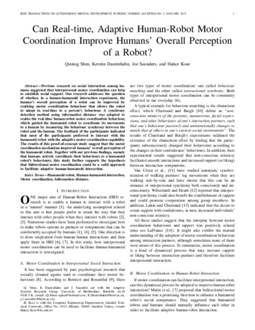 Previous research on social interaction among humans suggested that interpersonal motor coordination can help to establish social rapport. Our research addresses the question of whether, in a human-humanoid interaction experiment, the human’s overall perception of a robot can be improved by realising motor coordination behaviour that allows the robot to adapt in real-time to a person’s behaviour. A synchrony detection method using information distance was adopted to realise the real-time human-robot motor coordination behaviour, which guided the humanoid robot to coordinate its movements to a human by measuring the behaviour synchrony between the robot and the human. The feedback of the participants indicated that most of the participants preferred to interact with the humanoid robot with the adaptive motor coordination capability. The results of this proof-of-concept study suggest that the motor coordination mechanism improved humans’ overall perception of the humanoid robot. Together with our previous findings, namely that humans actively coordinate their behaviours to a humanoid robot’s behaviours, this study further supports the hypothesis that bidirectional motor coordination could be a valid approach to facilitate adaptive human-humanoid interaction.