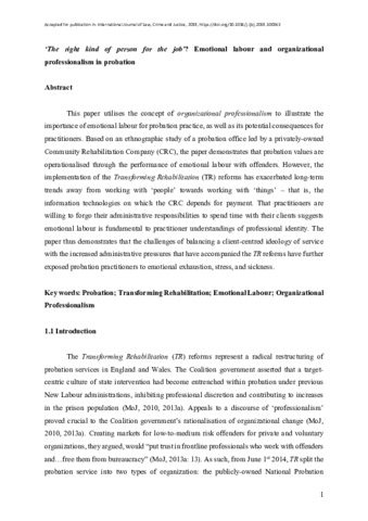 This paper utilises the concept of organizational professionalism to illustrate the importance of emotional labour for probation practice, as well as its potential consequences for practitioners. Based on an ethnographic study of a probation office led by a privately-owned Community Rehabilitation Company, the paper demonstrates that probation values are operationalised through the performance of emotional labour with offenders. However, the implementation of the Transforming Rehabilitation (TR) reforms has exacerbated long-term trends away from working with ‘people’ towards working with ‘things’ – that is, the information technologies used to log performance. That practitioners are willing to forgo their administrative responsibilities to spend time with their clients suggests emotional labour is fundamental to practitioner understandings of professional identity. The paper thus demonstrates that the challenges of balancing a client-centred ideology of service with the increased administrative pressures that have accompanied the TR reforms have further exposed probation practitioners to stress, strain, and sickness.