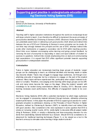 Teaching staff in higher education institutions throughout the world are increasingly faced with large cohorts to teach. It can therefore be difficult to implement the seven principles of good practice identified by Chickering & Gamson (1987). Electronic Voting Systems (EVS) can potentially assist tutors in delivering such good practice. Both direct and indirect links between the use of EVS and Chickering & Gamson‟s seven principles can be made. Di-rect links map strongly between the principle and the use of EVS, whereas indirect links evoke other mechanisms or suggest a secondary role for EVS within teaching practice. Direct links occur between encouraging active learning and giving prompt feedback, by removing the lack of anonymity to responding in class and rapid collation of student re-sponses to questions. Indirect links include emphasising time on task and communicating high expectations. It is argued that EVS offers significant potential towards supporting good practice in undergraduate education.