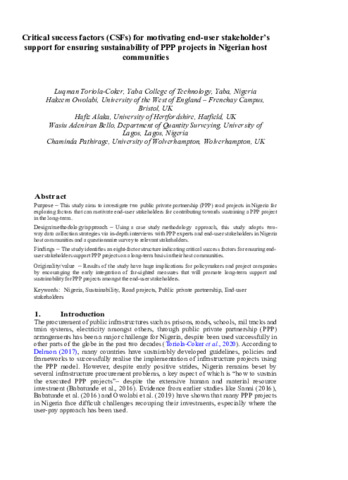 Critical success factors (CSFs) for motivating end-user stakeholder’s support for ensuring sustainability of PPP projects in Nigerian host communities